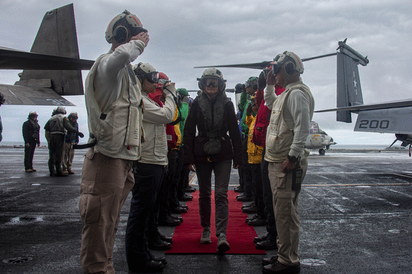 Murkowski donned a helmet, life preserver and goggles to fly, she said, 200 miles across the Gulf of Alaska in a twin-rotored Osprey aircraft — peering out over an open ramp that looked onto the "wide ocean." She was greeted on deck by an honor guard, then watched as Navy personnel coordinated the takeoff of a dozen fighter jets, communicating solely through hand signals because of the roar of the engines.