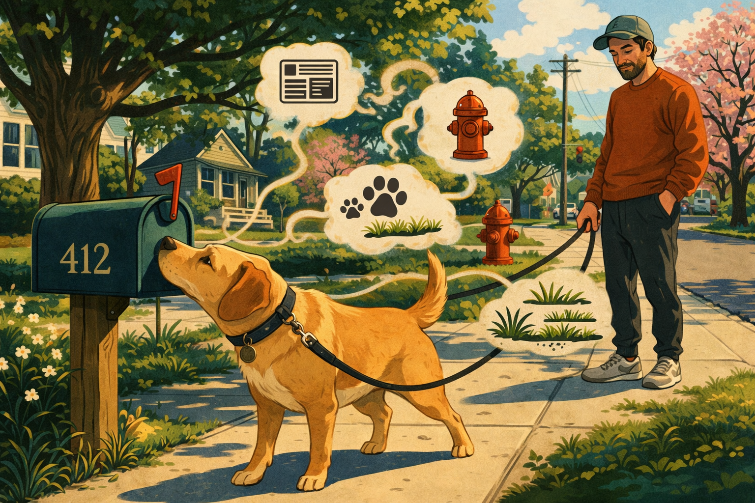 What appears to be aimless wandering is, in fact, a structured ritual. Every mailbox, hydrant, and blade of grass carries a record. Dogs move through the neighborhood not as tourists, but as subscribers to a daily publication written in scent, refreshed constantly, and read with absolute seriousness.