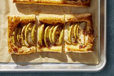These apple tarts look and taste like they came from the bakery but are so easy to whip up yourself. An ultra-flaky, buttery puff pastry crust frames tart-sweet Granny Smith apple slices, while the warm flavors from the fruit soak into the pastry. To prevent your apple tarts from becoming soggy, leave any juices from the apple slices behind in the mixing bowl.